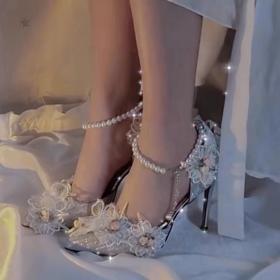 フェアリースタイルフラワーエレガントハイヒール女性のための 2025 夏の新しいフレンチスタイルスカート付きパールスティレットヒール靴
