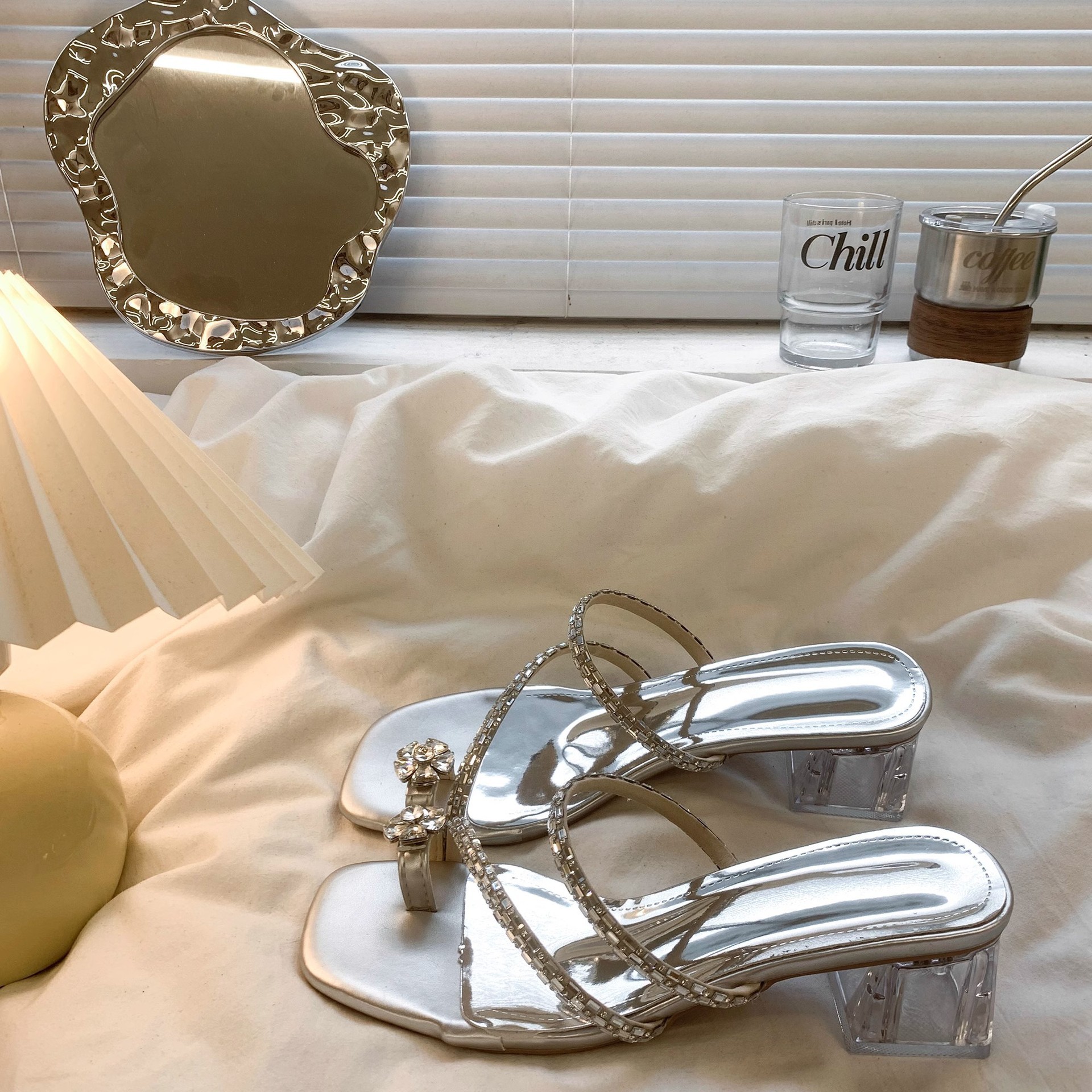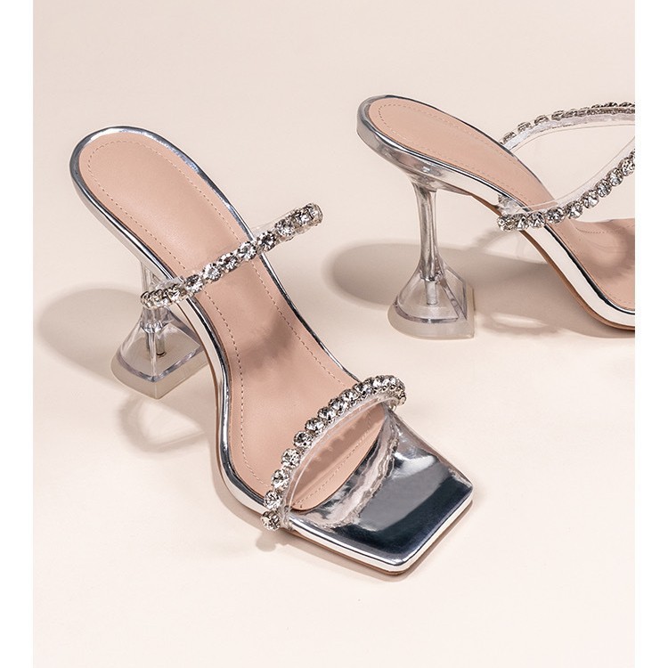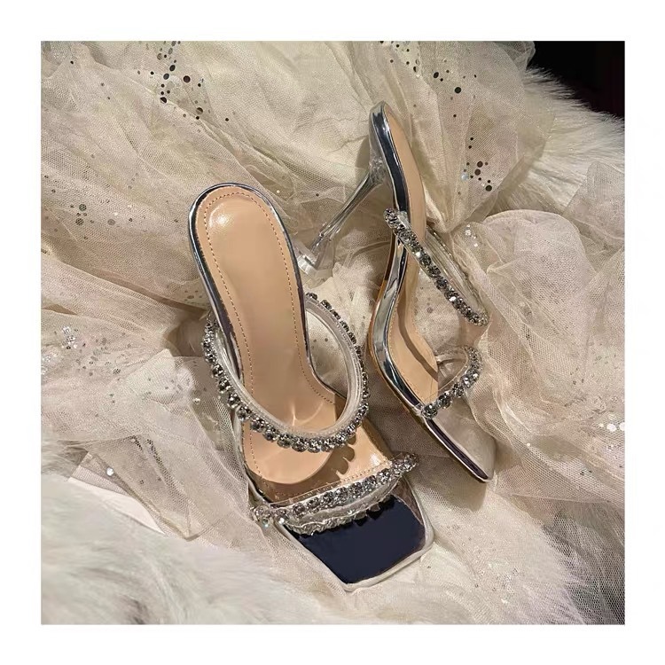ラインストーン透明バンドスリッパ女性の夏の新しい韓国スタイルのハイヒールの靴女性のスクエアトゥ多用途ファッションサンダル