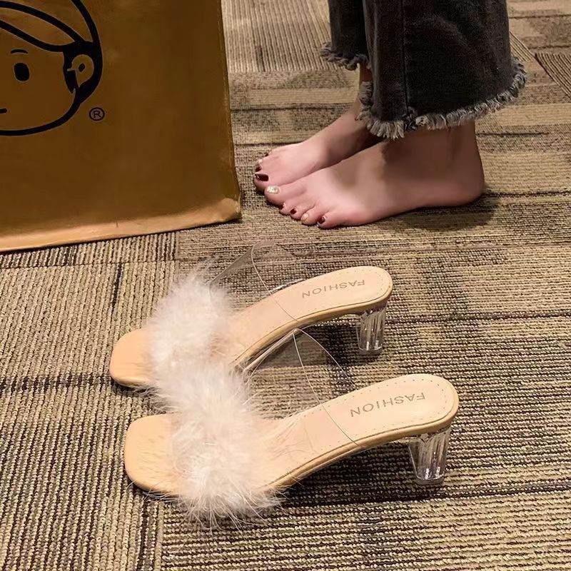 女性の夏のアウターウェア用の毛皮のようなサンダル 2025 新しいフェアリースタイルのワンラインクリスタル太いヒールとスカート付きフレンチハイヒール