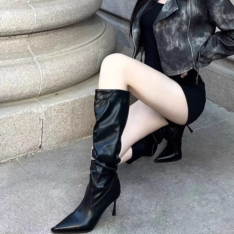 ヨーロッパとアメリカの女性用ポインテッドトゥプリーツハイブーツ2025秋冬スリムパイルブーツハイヒールニーハイブーツ