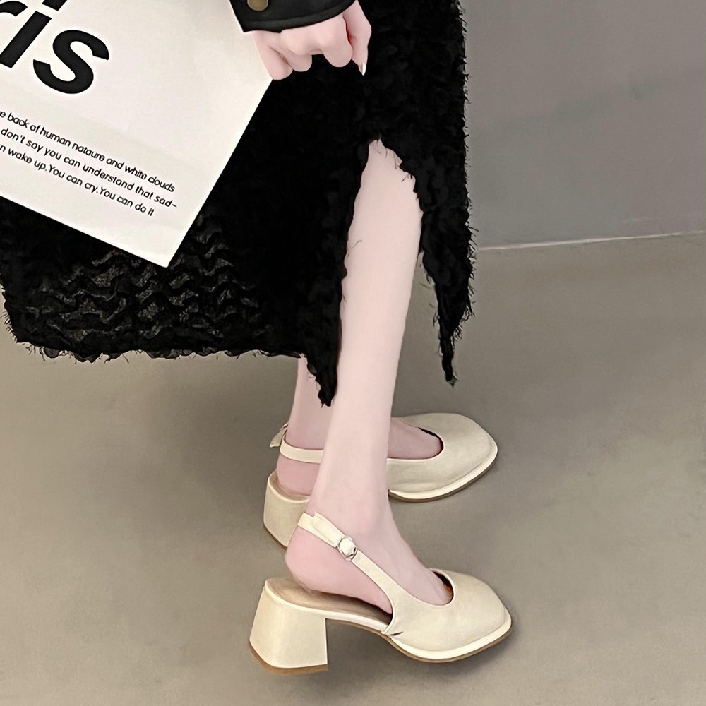 フレンチワンラインバックルハイヒール、ヒールオープントゥサンダル、スクエアトゥミディアムヒール、メリージェーンシューズ、女性用太ヒールシューズ