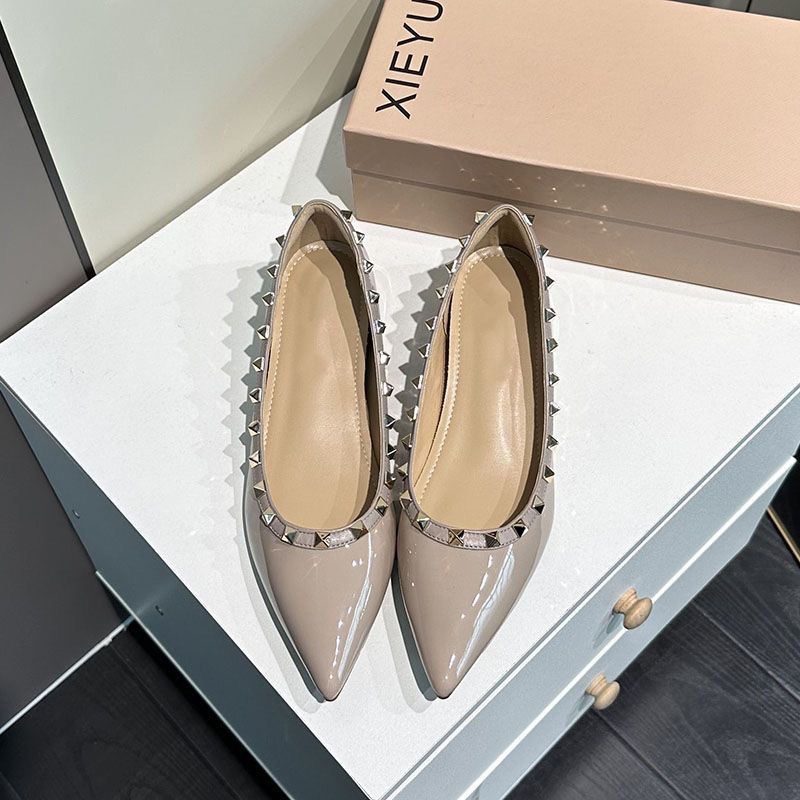 铆钉尖头平底时尚单鞋女2025年新款漆皮一脚蹬浅口平跟船鞋