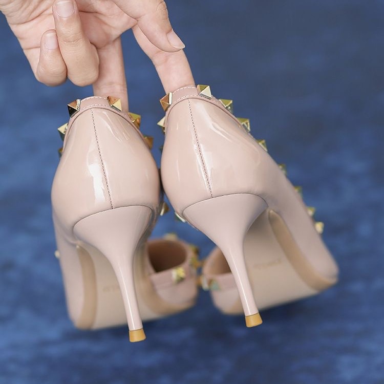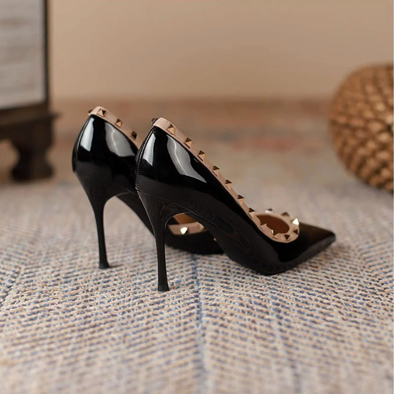2025 女神ポインテッドトゥ浅い口薄いヒールハイヒールヌードパテントレザーサイド中空リベットファッション靴女性のセクシーさ