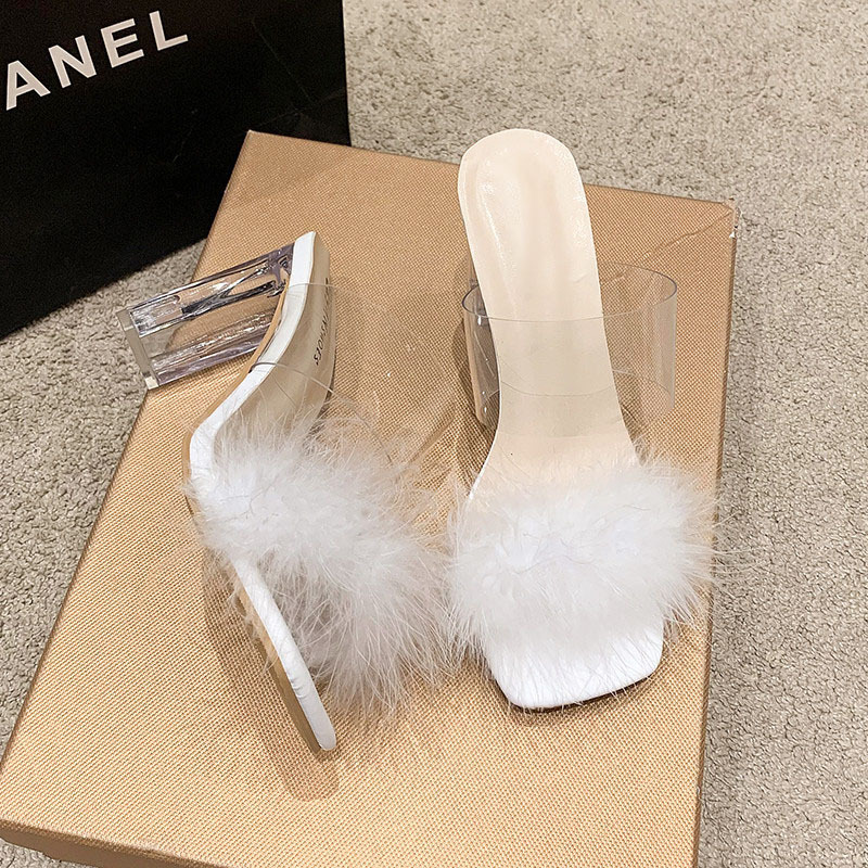 サンダル女性の夏の厚いヒールオープントゥ毛皮のような靴透明クリスタルハイヒールニッチ美しいファッションスリッパスタイル