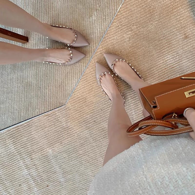 ポインテッドトゥリベットシューズ、フレンチスタイルパテントレザーシューズ、イブニングスタイル、優しいヌードカラー、身長アップフラットシューズ、パンプス