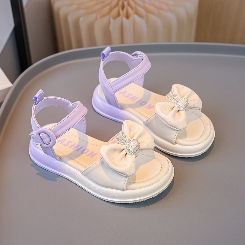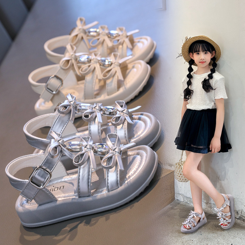 女の子のスタイリッシュなリボンサンダルプリンセスシューズ 2025 夏の新しいソフトソールビーチシューズ中型および大型子供用カジュアルサンダルトレンディ
