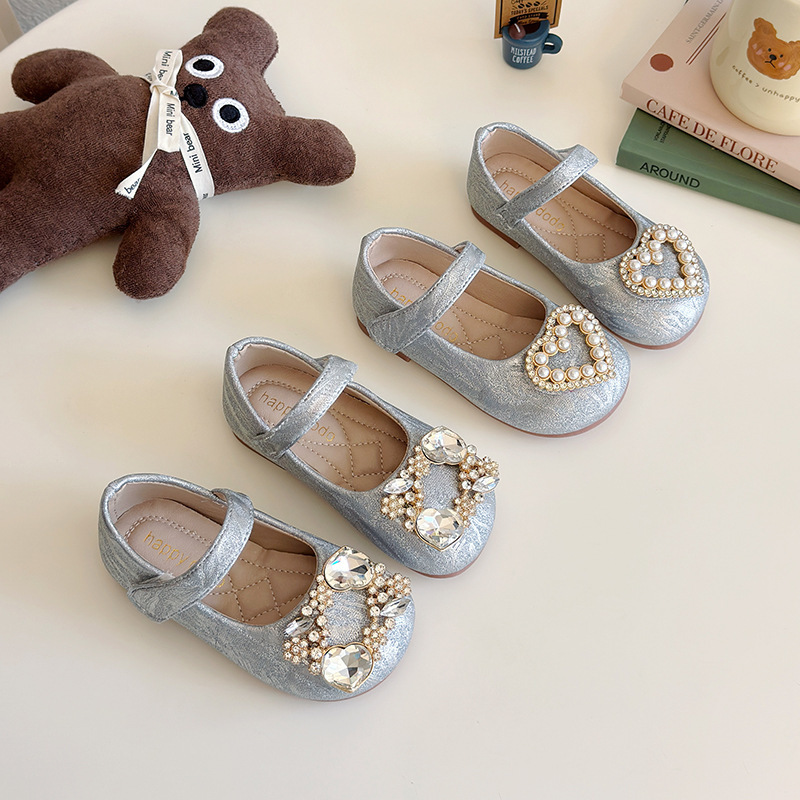 女の子シルバーレザーシューズ 2025 新しい子供のソフトソール女の子浅い口の靴ビーニーシューズ小さな香りプリンセスシューズ