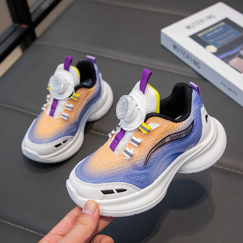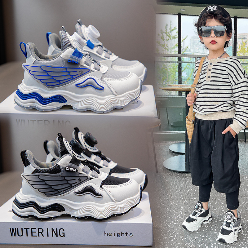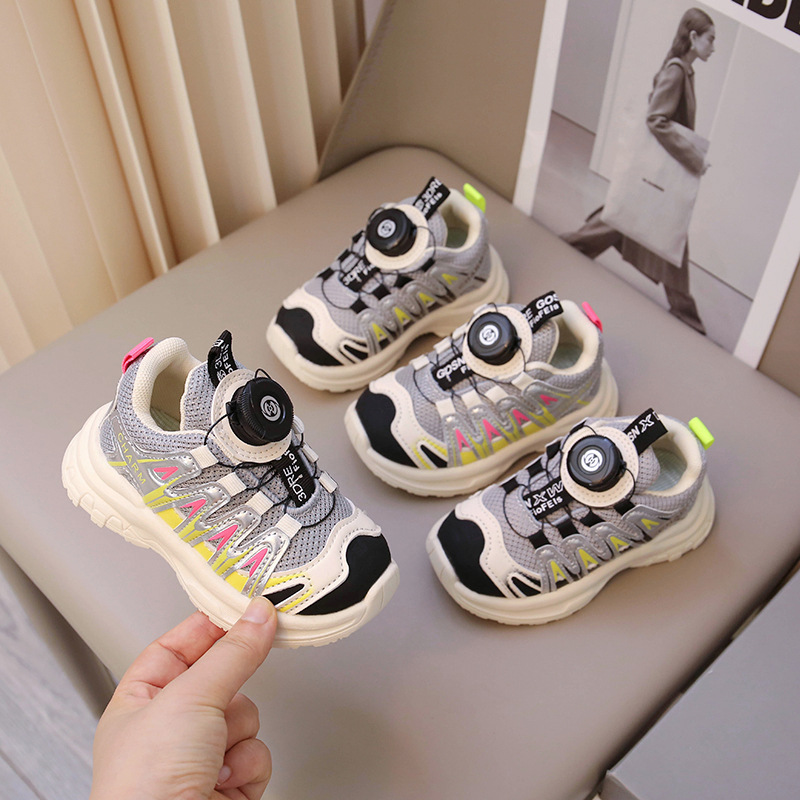 秋の新型子供運動靴黒い男の子運動靴の回転ボタンは女の子のランニング運動靴を漕いでいます。