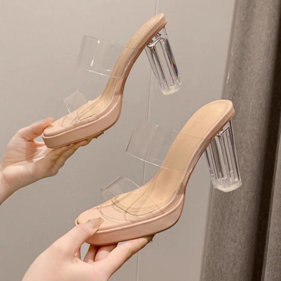 透明スリッパ女性のハイヒール 2025 新しい夏のニッチデザインワンラインクリスタル厚いヒールサンダル