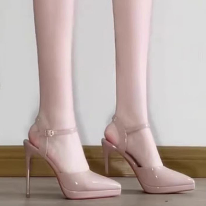 フレンチスタイルのスティレットヒール防水プラットフォームブラックハイヒールシューズワンラインバックルストラップ厚底ヌードポインテッドトゥサマーアウターサンダル
