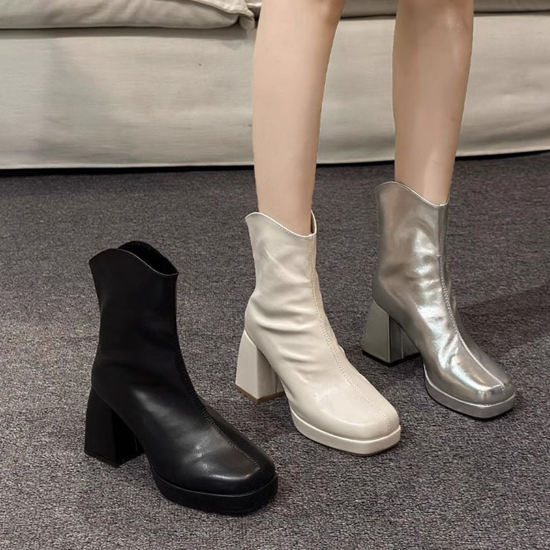 フレンチラウンドトゥ厚底伸縮性スリムハイヒールショートブーツレディース英国風ウエスタンスリムスカート付きハイヒールショートブーツ