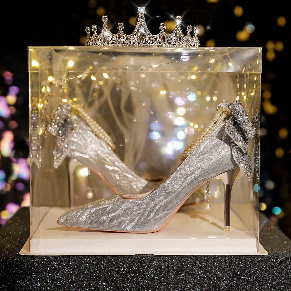 新しい 2025 クリスタルスパンコールのウェディングドレスツーウェアリボンパールウェディングシューズブライダルハイヒール女性のスティレットヒール