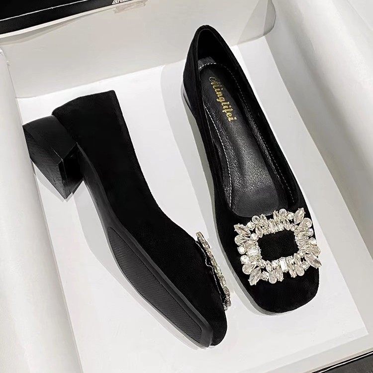 女性のためのシングルシューズ 2025 春の新しいスタイルの小さな香りのスクエアトゥスエードラインストーンスクエアバックル浅い口厚いヒールローヒールの女性の靴