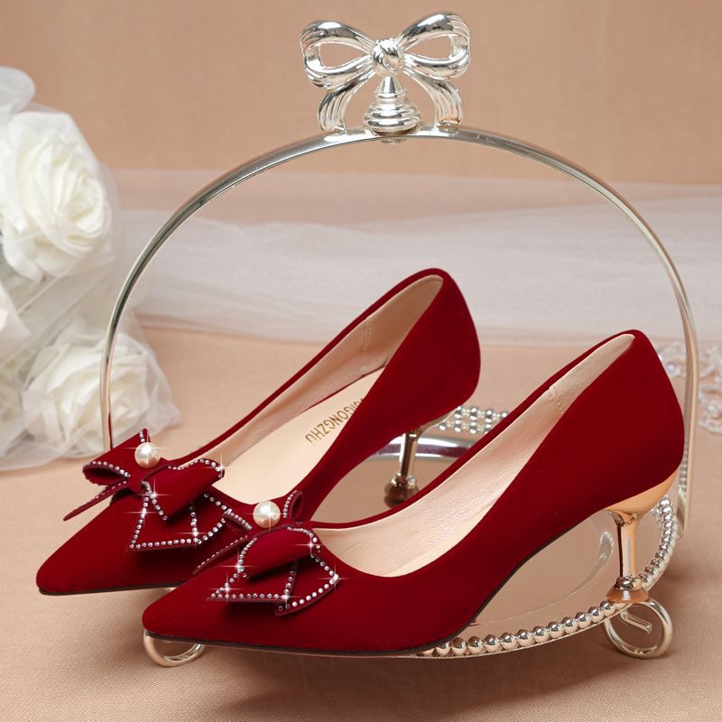 女性用ウェディングシューズ 2025 新しいブライダルシューズ、足が疲れにくいハイヒール、赤い秀和のウェディングドレス、中国風の結婚式の乾杯靴