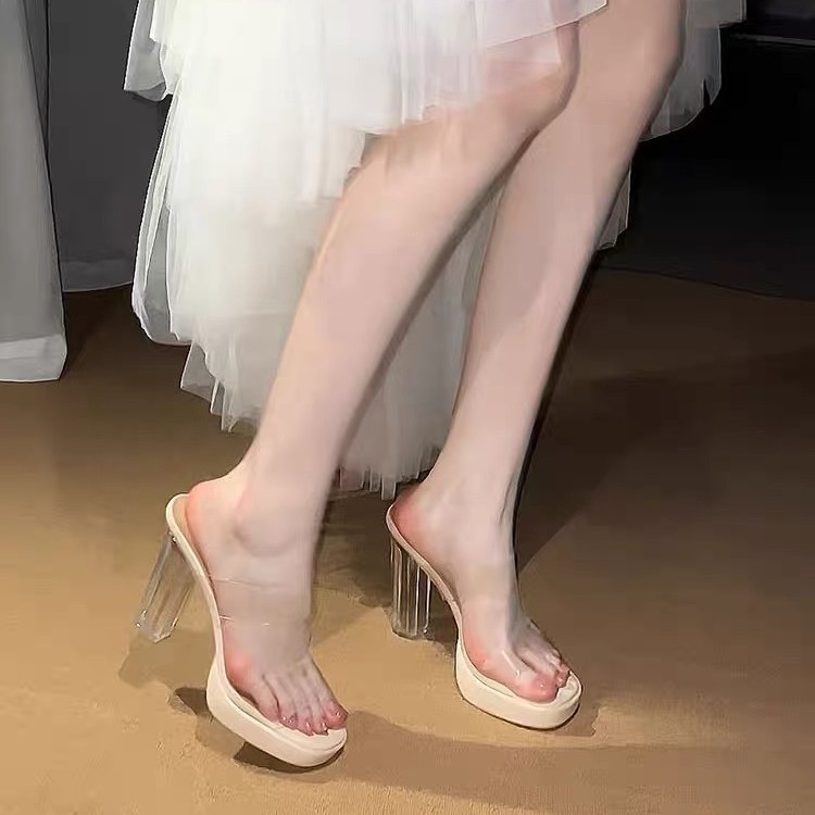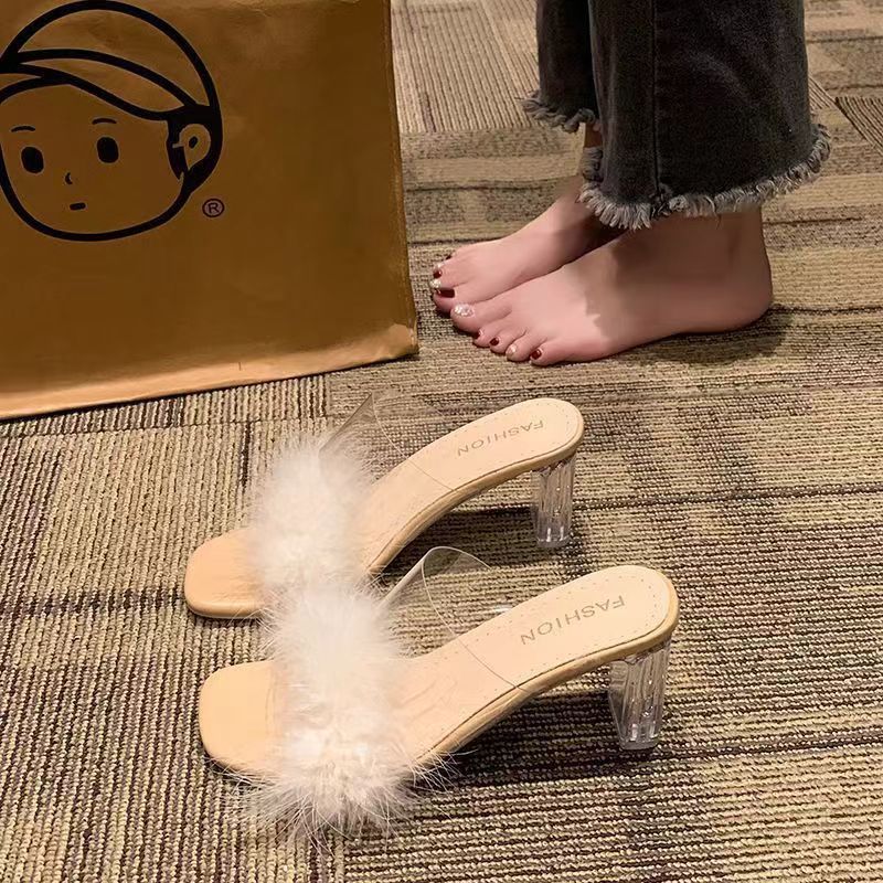 フレンチ太ヒールハイヒール、フェアリースタイルサンダル、夏気質サンダル、ニッチファーアウターウェア透明スリッパ