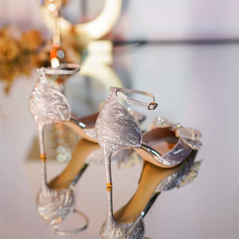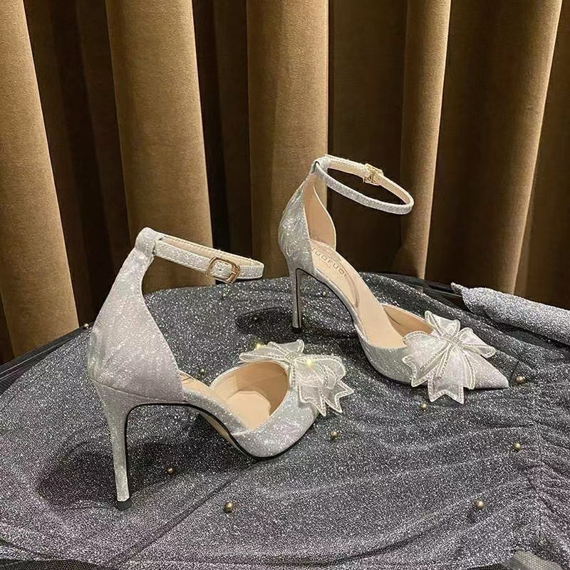 クリスタルウェディングシューズ、ウェディングドレス、細いヒール、足が疲れにくい、2025年新作、スカート付き、シルバーハイヒール、夏