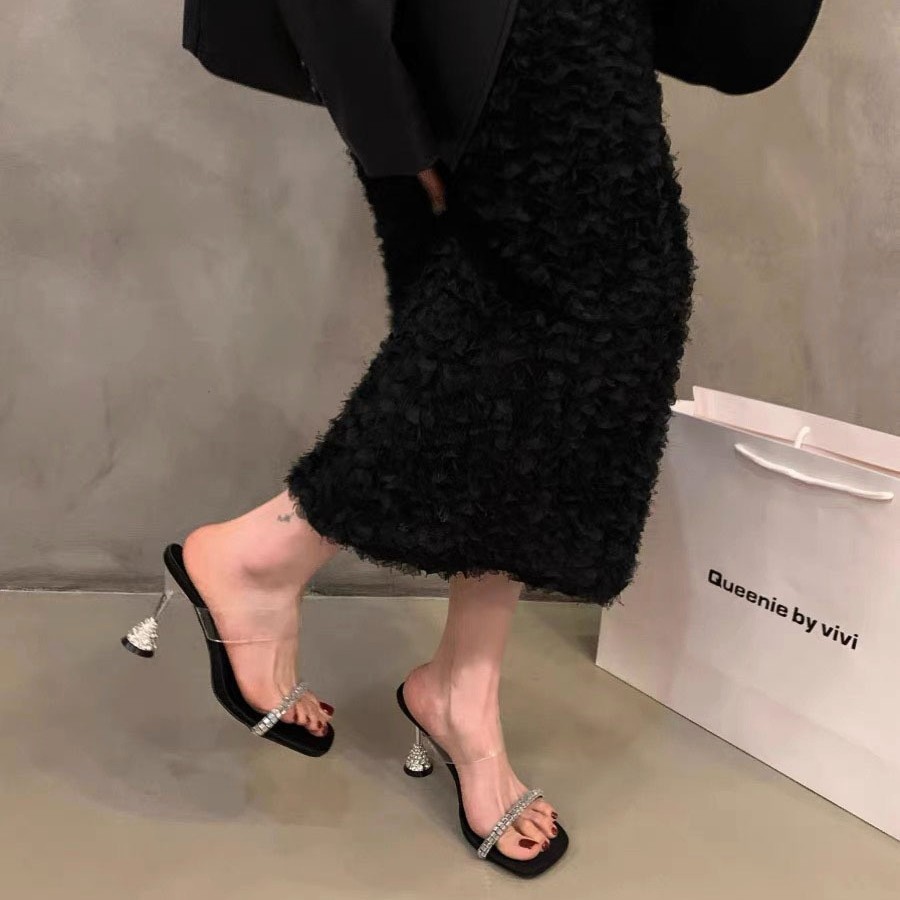 美しいハイヒールスリッパ夏アウター 2025 新しいラインストーンフレンチフェアリースカート透明クリスタルサンダル