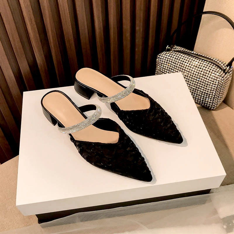 包頭ハーフスリッパ女性の夏のアウターウェア 2025 新しいファッションポインテッドトゥフェアリースタイル厚いヒールサンダル女性の気質の女性の靴