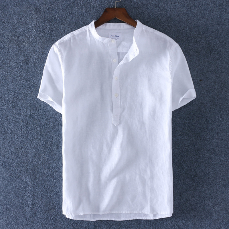夏の白い半袖立襟純亜麻シャツ男性カジュアル麻生地上着綿麻ジャケット半袖シャツ男性