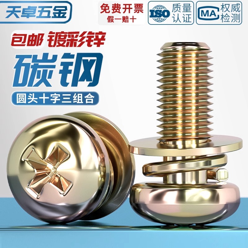 カラーメッキ亜鉛丸頭十字三連ネジ皿頭平座圧ネジボルト M3M4M5M6M8mm