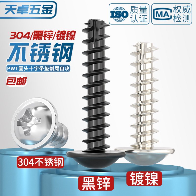 PWTニッケルメッキ/黒/304ステンレス十字丸頭パッド付き切断尾タッピング小ねじ盤平尾