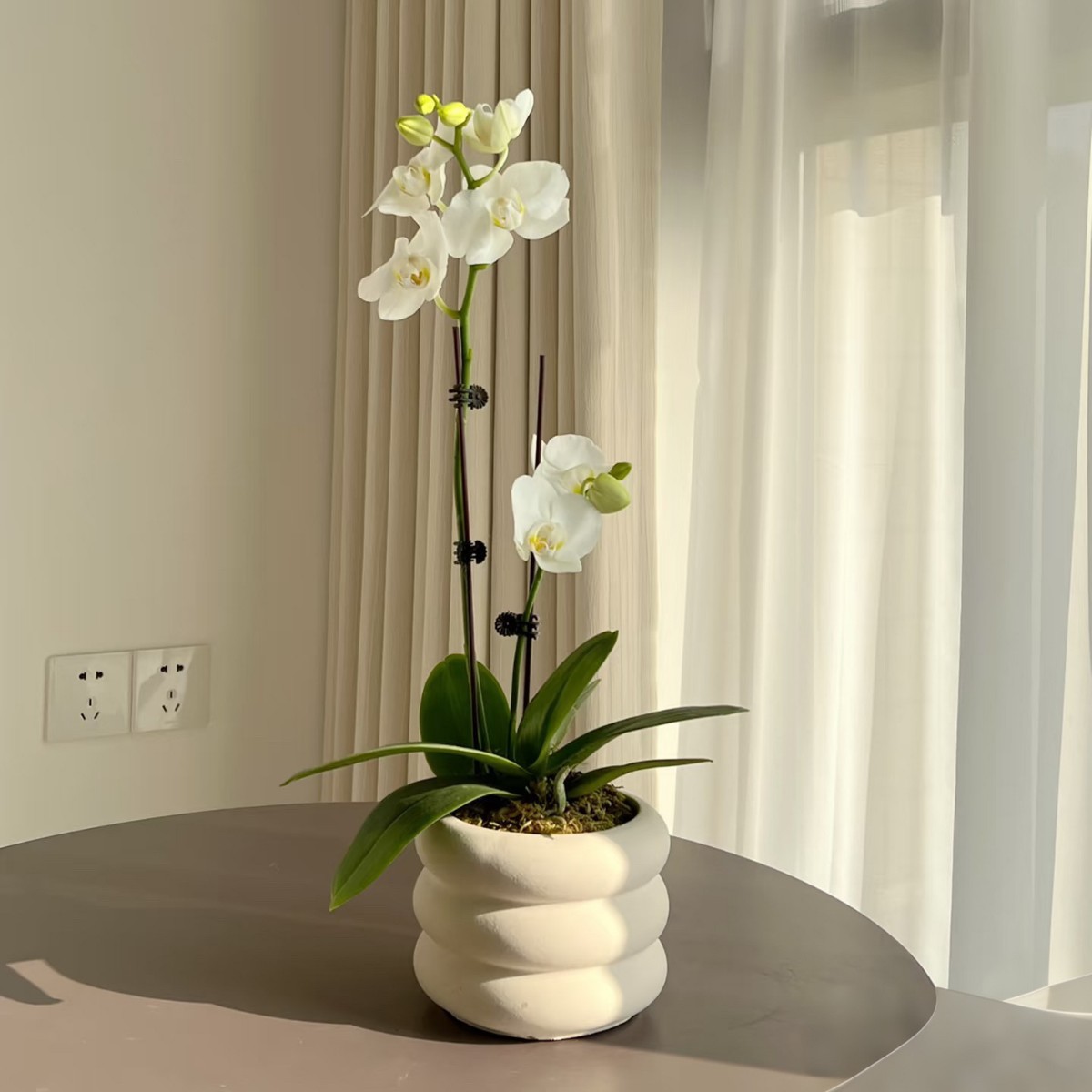 銀色の胡蝶蘭の植木鉢は軽くて高級感があります。