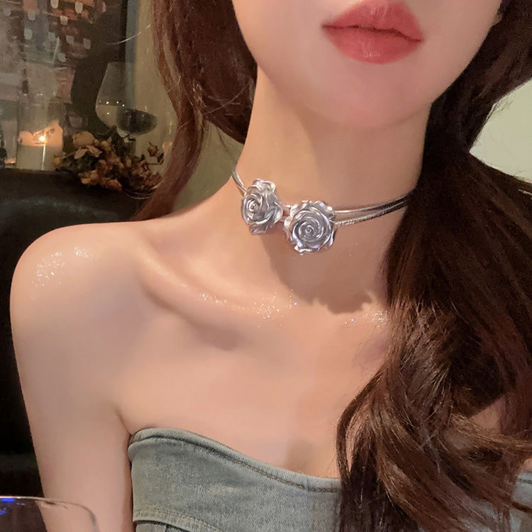 銀色のバラの花のchoker首輪の女性の首の輪の革の二重のネックレスの首は鎖の鎖の潮を飾ります。