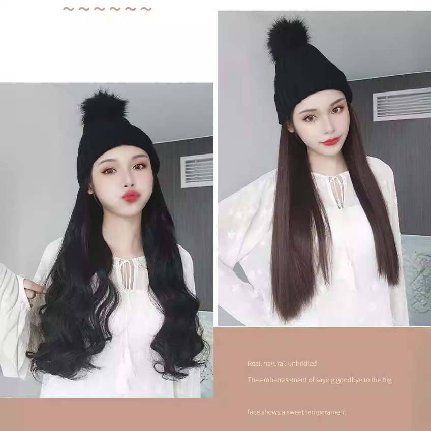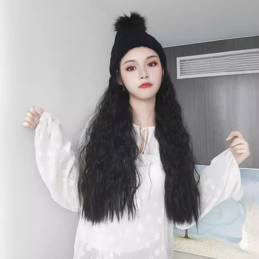 帽子かつら一体秋冬分割ニット帽ウール巻きロングカールかつら帽子メーカースポット卸売り