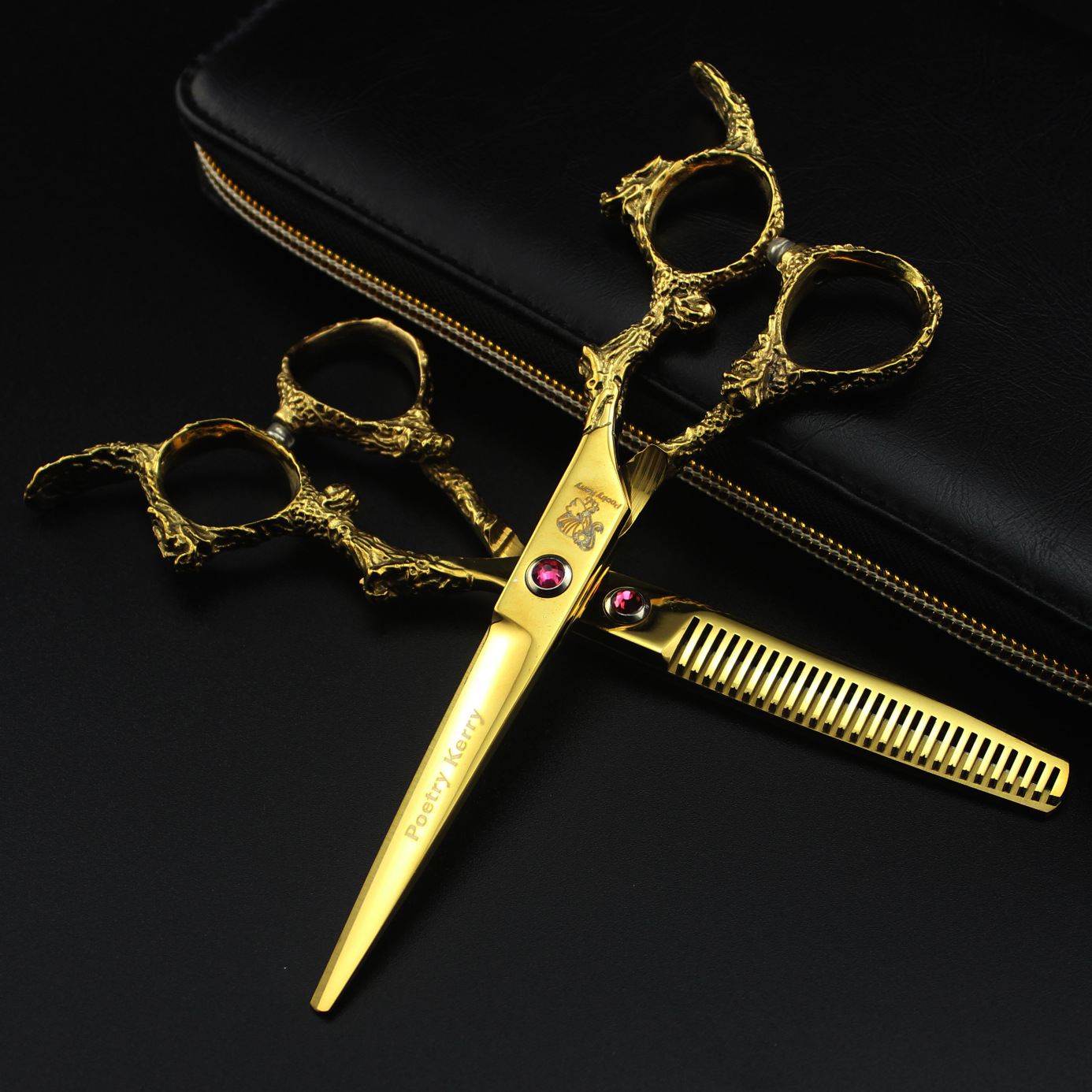 6.0inch PK ゴールドカラー 怪獣柄 美容師用ハサミ 散髪用ハサミ フラットハサミ 前髪ハサミ ディフューザーハサミ 薄削りハサミ