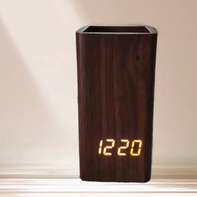 クリエイティブなペン立て目覚まし時計、静音、音声制御、多機能LED木製電子時計、オフィス、学生用ペン立て木製時計