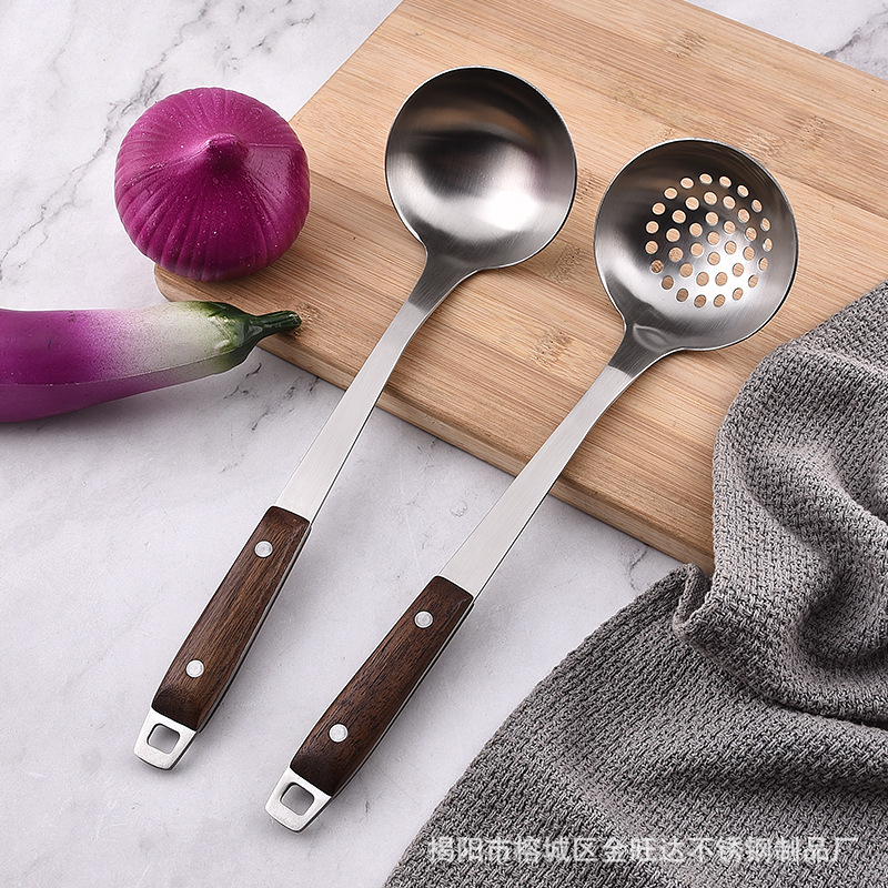 304ステンレススープの殻の厚いタイプのスプーンの調理用品の食器の火鍋のスプーンの台所の調理の胡桃の木の取っ手