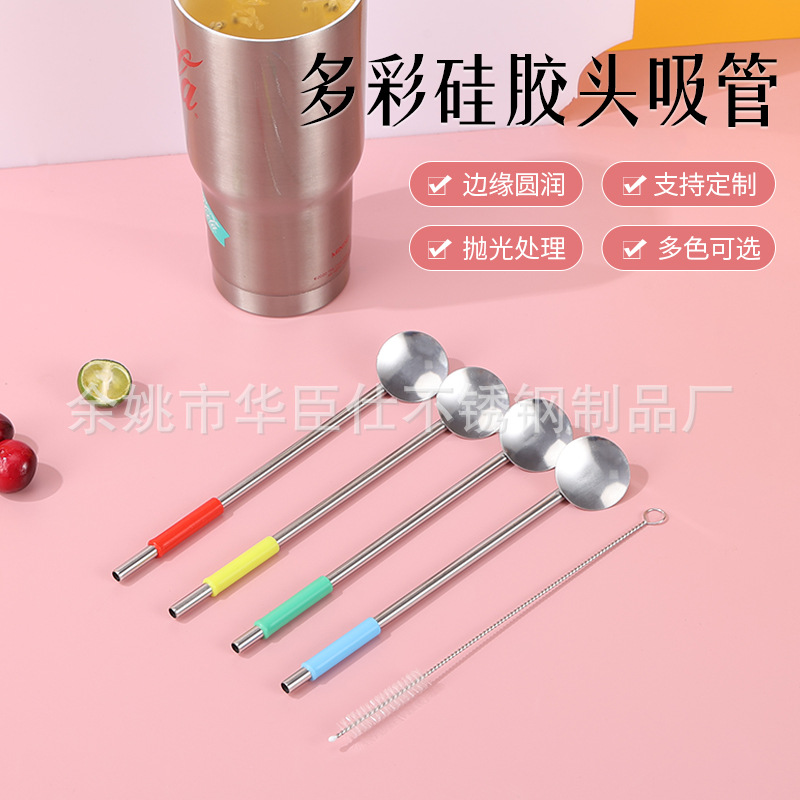 新商品創意砂氷撹拌スプーンストロー付きシリコンカバー洗浄ブラシステンレスストロースプーンセット