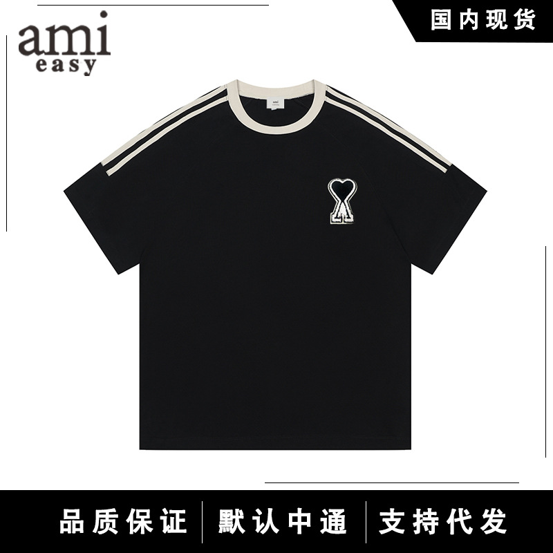 AMI&EASY スリーストライプス クラシック アメリカン Tシャツ トレンド メンズ 夏 新作 ラウンドネック ゆったり おしゃれ シンプル カップル