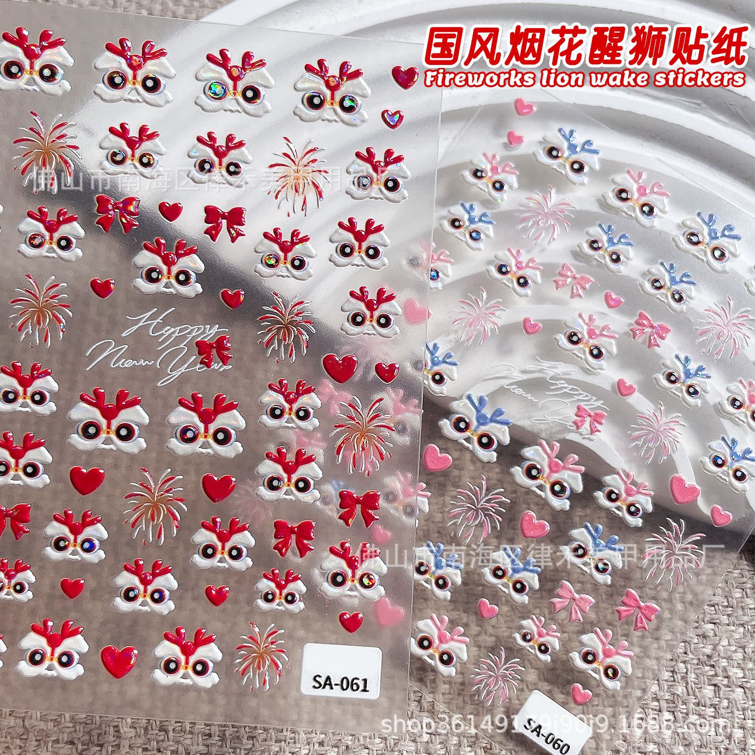 鴻運目が覚めたライオンのネイルシール蛇年ネイルアクセサリーのレリーフ爪に花火新年福字立体シールを貼る