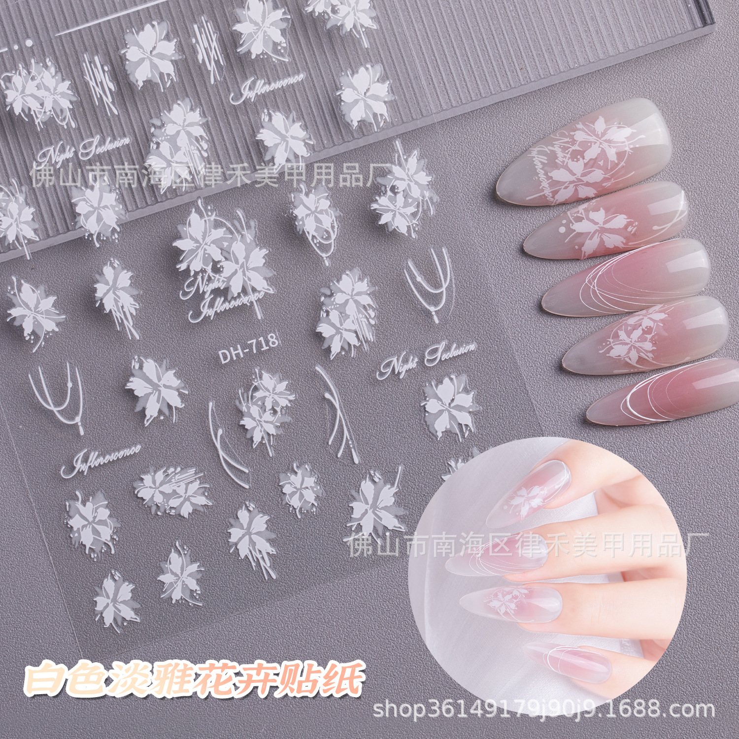 新しい白色の上品な花の五葉の花のネイルシールは透かし彫りしてシンプルな白い線の英語のアルファベットはゴムを貼ります。
