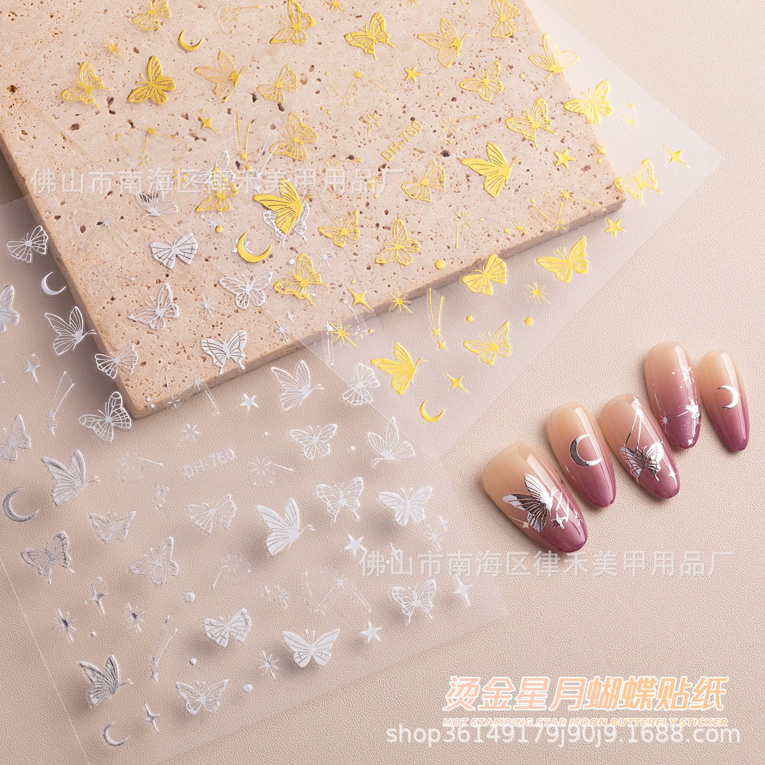 新しい2d箔押し銀星月蝶ネイルシール透かし彫り美しい豪華な蝶星月爪貼り