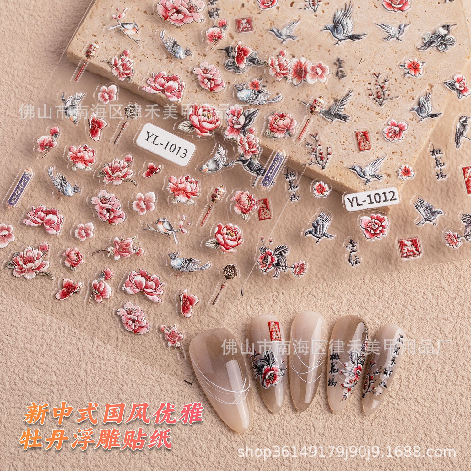 新中国式国風ネイルシール浮き彫り立体牡丹花国風唯美古詩詞優美白鶴爪貼り