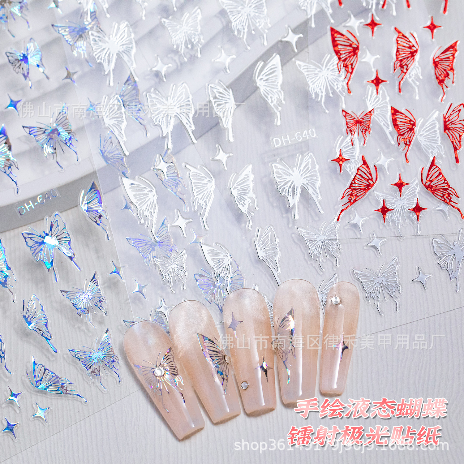 新しい透かし彫りの液体の蝶のレーザーの極光のネイルシールの極光のレーザーの手描きの蝶のシールの装飾品の卸売り