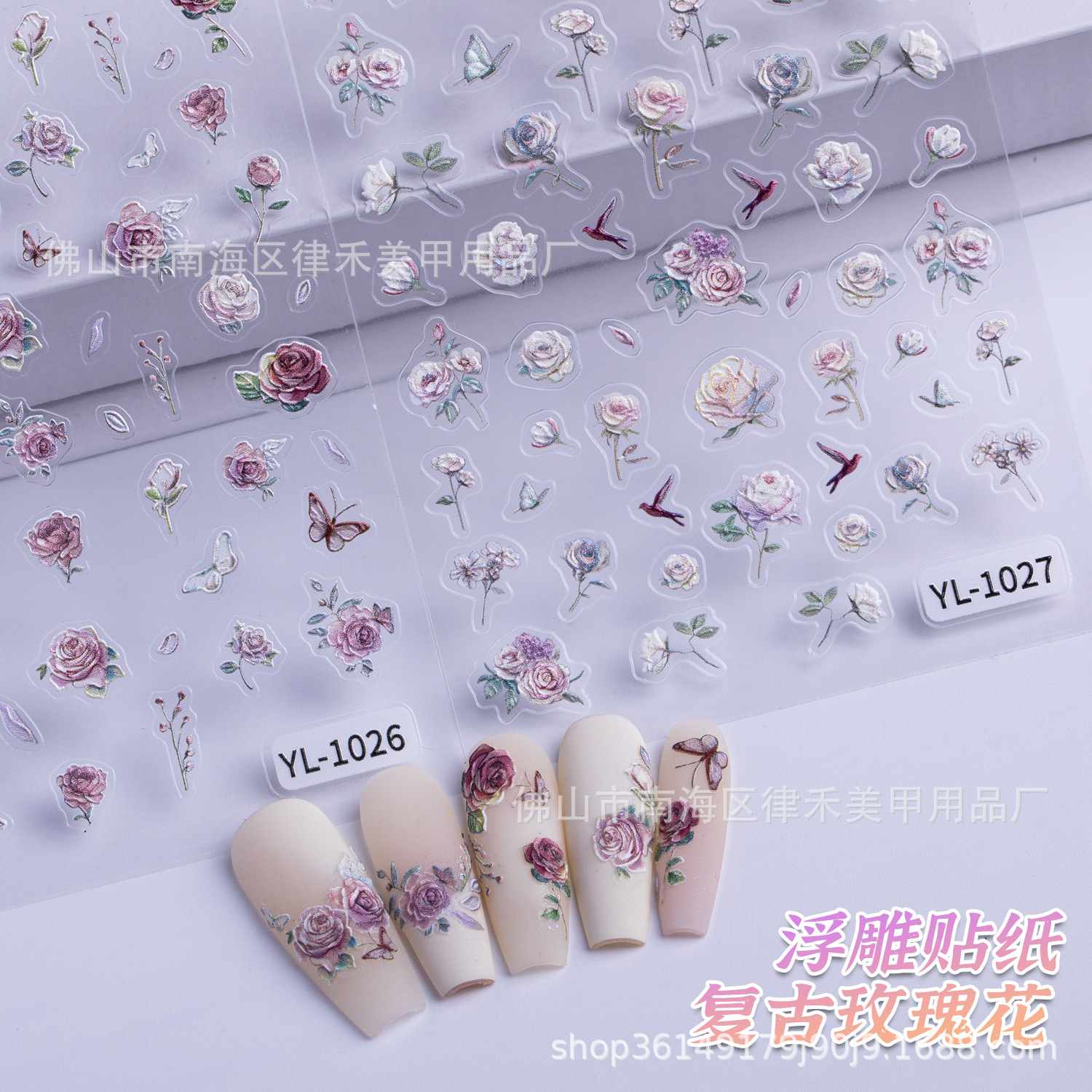 5D 人気のレトロローズネイルアートステッカーシンプルな野生の花蝶落ち葉鳥立体レリーフネイルステッカー