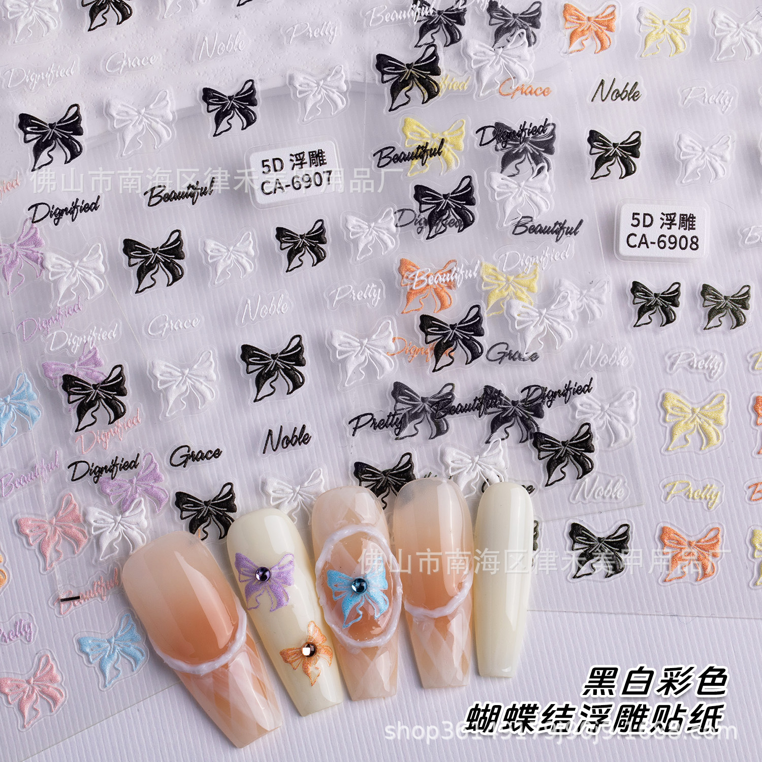 5D浮き彫り立体白黒多彩蝶ネクタイ美甲貼りシンプルで優しい英語アルファベットネイルシール