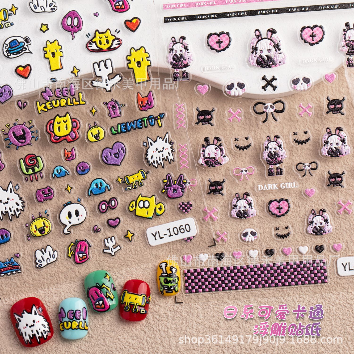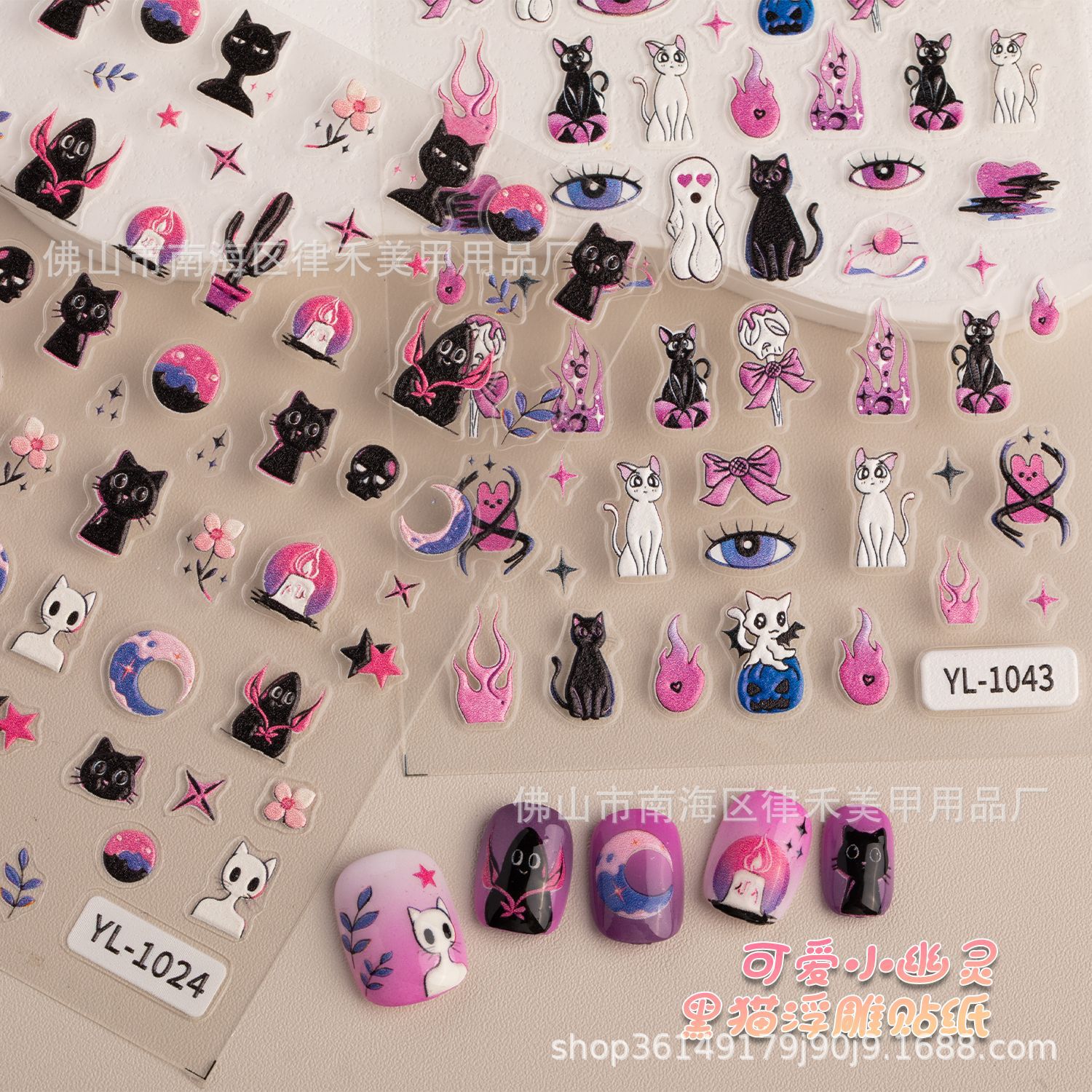 新しい漫画ゴースト子猫ネイルアートステッカーエンボス加工立体スカルスタームーンゴーストファイアリボン卸売