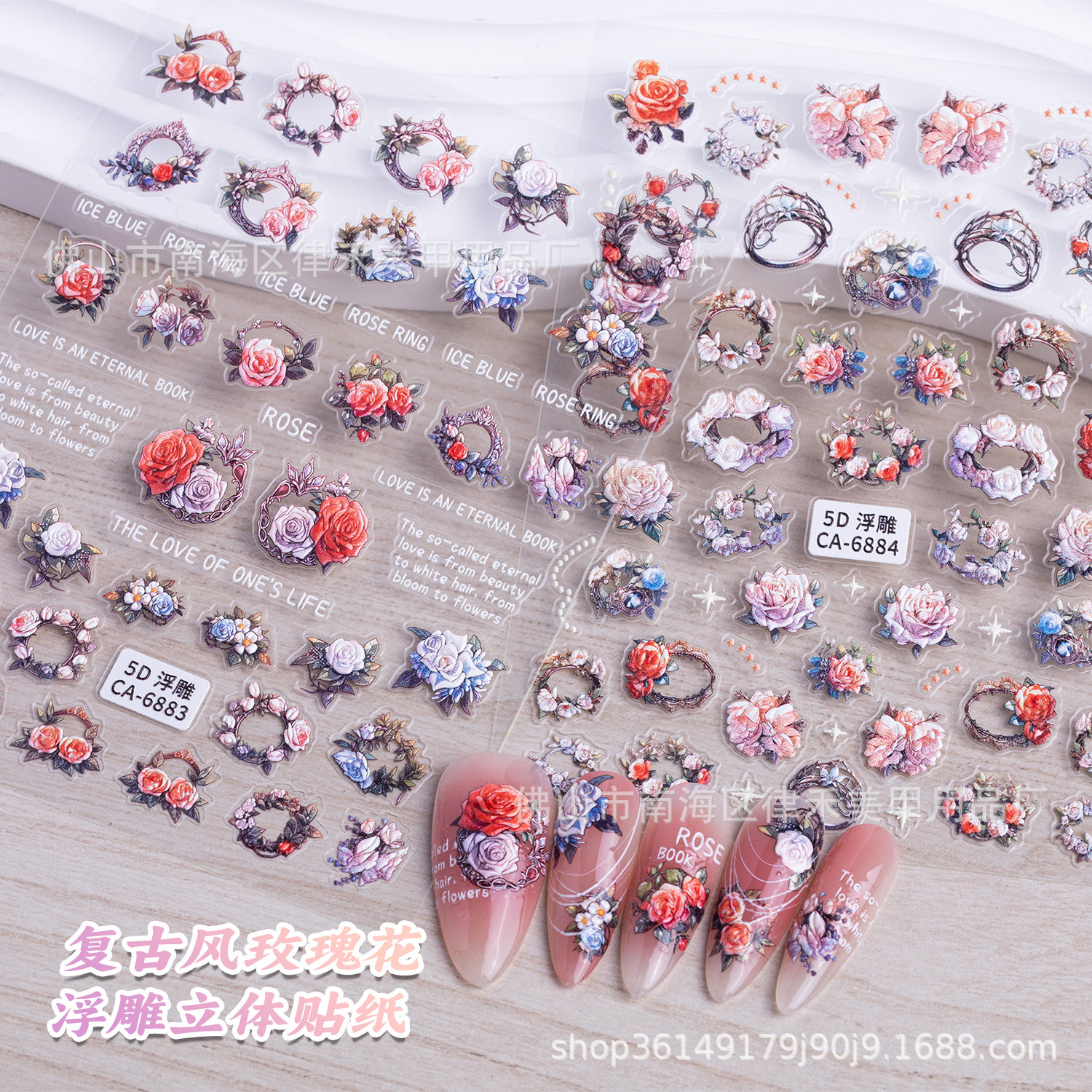 ネットの赤い新型の復古風のバラの花の立体の優しいバラの花輪の指輪の星の復古の英語のネイルシール
