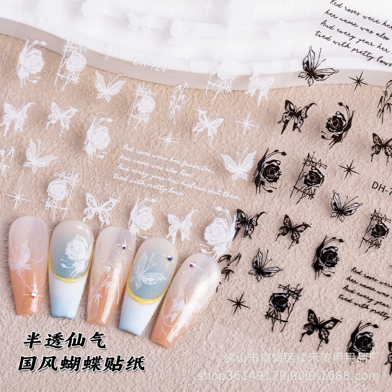 新しい妖精の黒と白の蝶ネイルアートステッカーハイエンドライト高級中空ダークスタイルスター柳の枝粘着裏地付き卸売