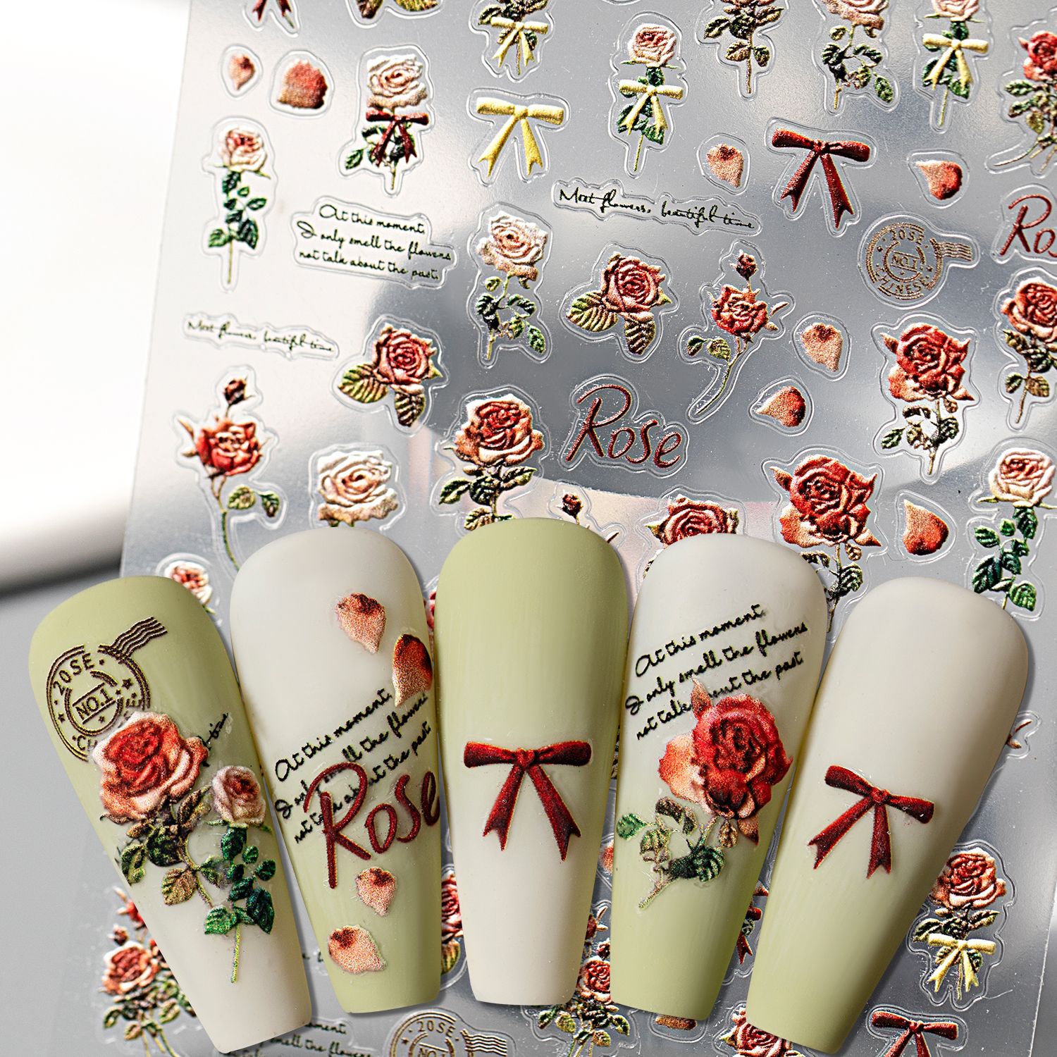 5dレリーフ立体ネイルシールレトロバラの花柄ボーダー蝶結び英語アルファベット爪飾り