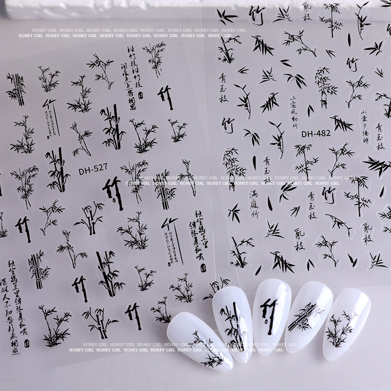 国風ネイルステッカー竹水墨白黒文字古風書道ネイルステッカー3d緑竹トンボ中国風