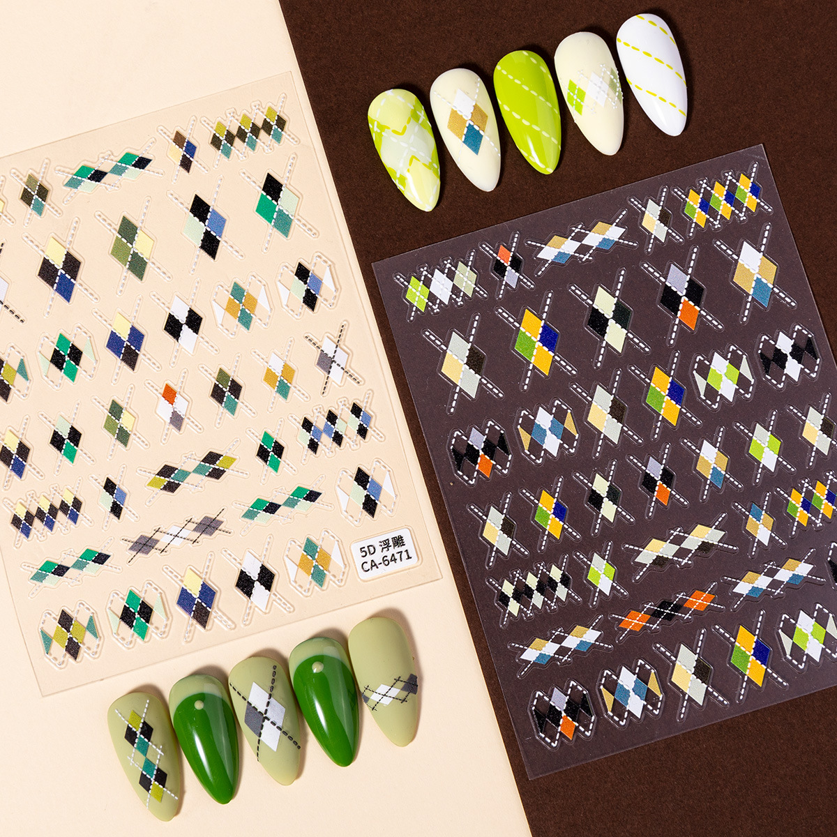 5dレリーフひし形格子模様立体ネイルステッカーレトロ格子千鸟格子白黒茶色盘爪ステッカー