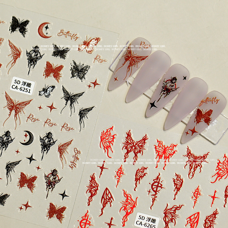 5dレリーフ新作立体黒と白蝶プルネイル英語星月クロスダークレッド蝶