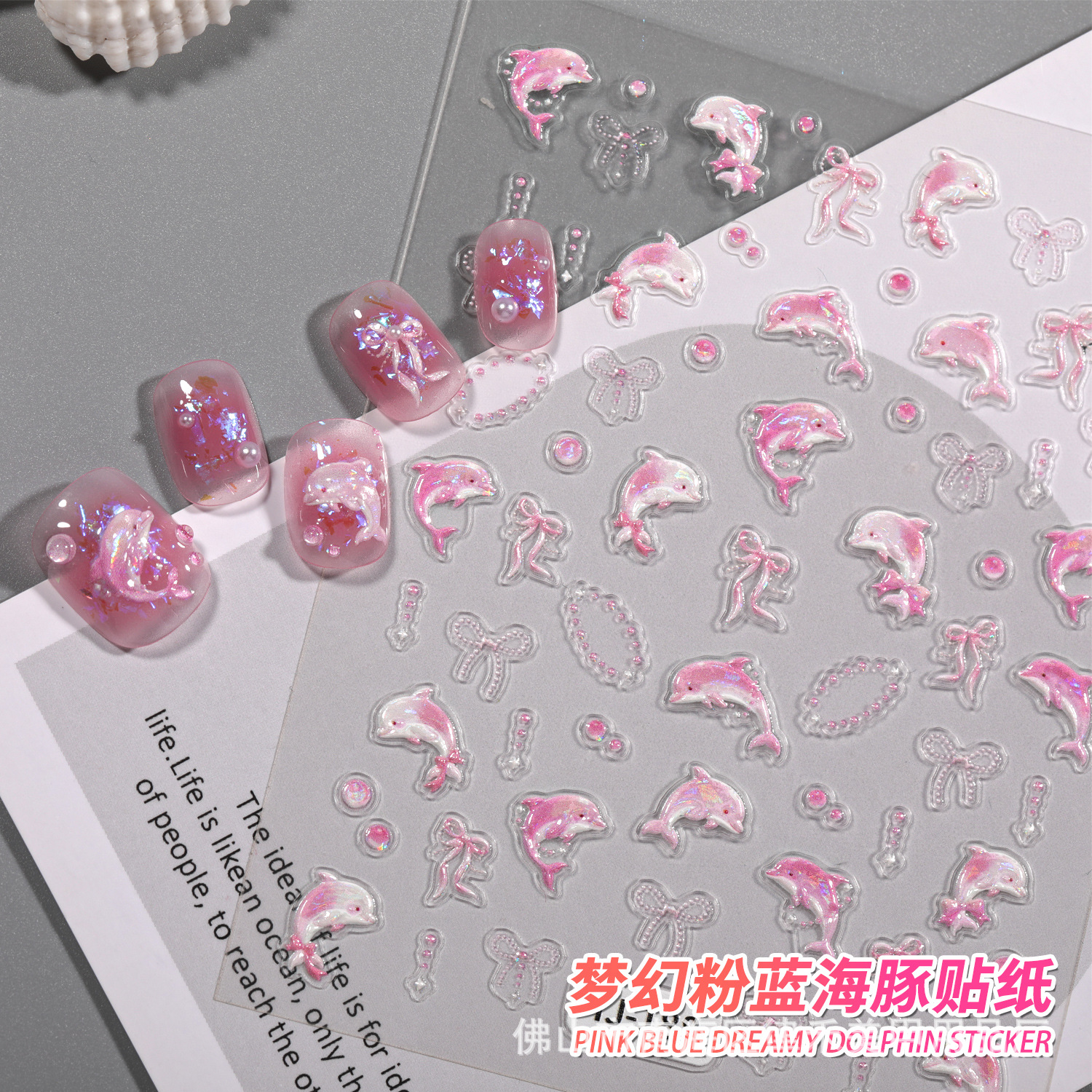 ネットセレブ人気シェルライトかわいいイルカネイルアートステッカーレリーフファンタジーピンクブルーリボンイルカ立体デカール