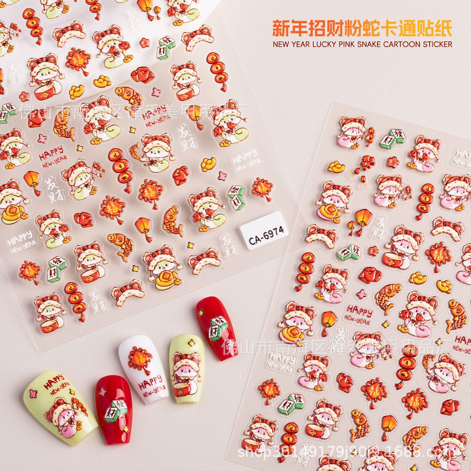新しいヘビ年新年ネイルアートステッカーエンボス加工立体かわいいヘビベビーレッドランタンフォーチュンゴールドインゴットネイルステッカー