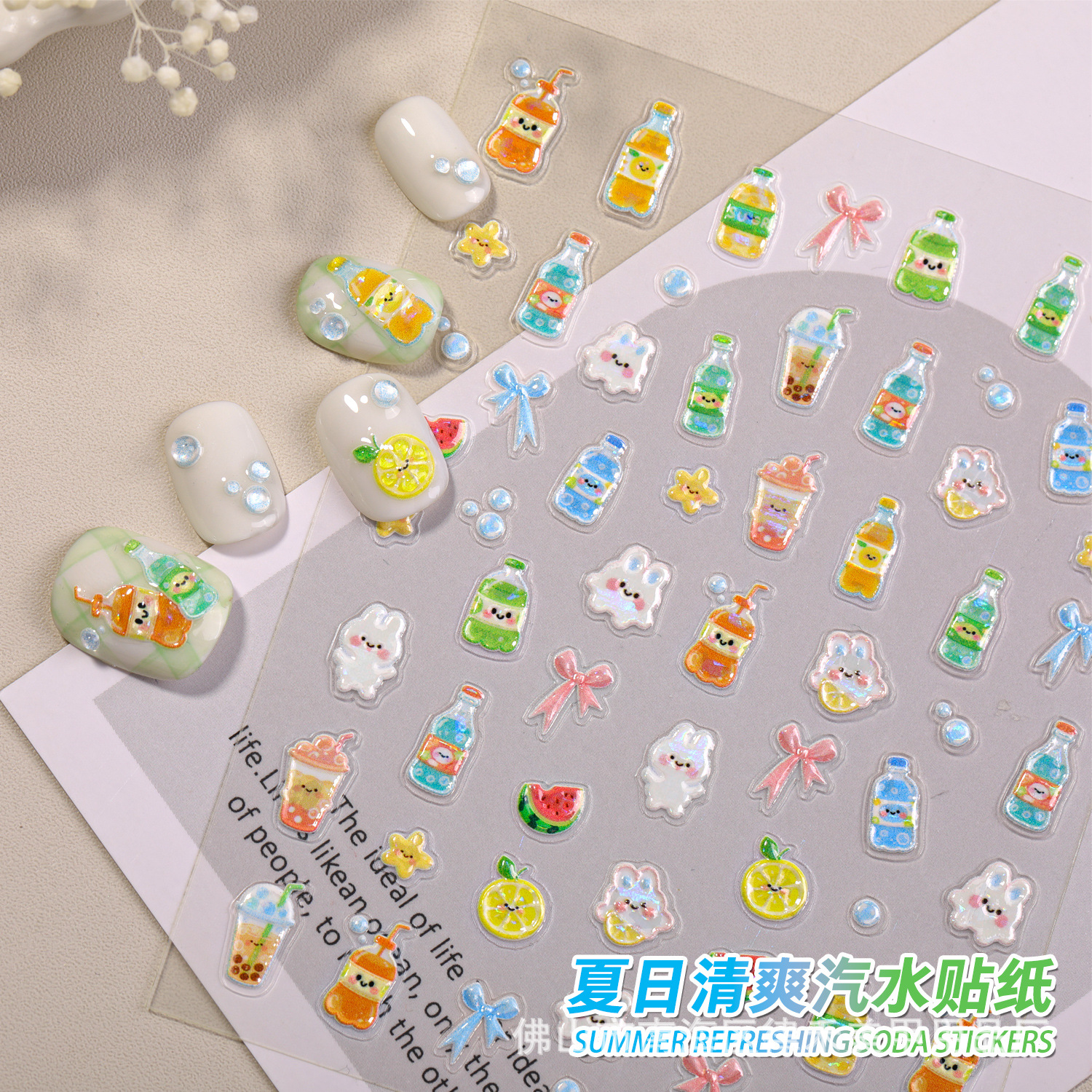 新しい夏風ドリンクソーダマニキュアステッカーエンボス加工立体かわいいウサギミルクティー漫画 diy ネイルステッカー